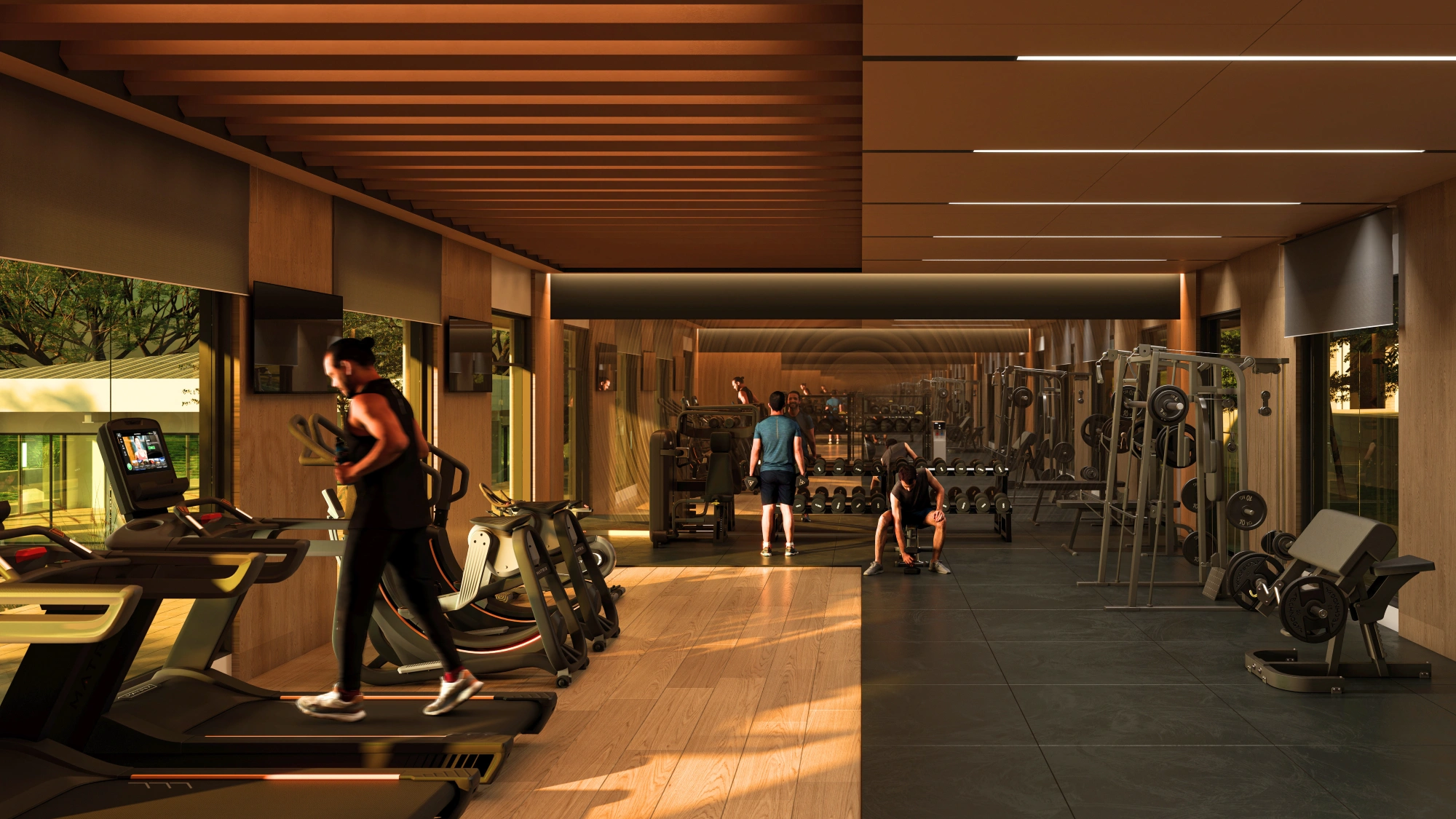 Conceptual rendering of the new indoor fitness gym. Residents are offered a private and well-equipped space to maintain an active lifestyle without leaving far from home.